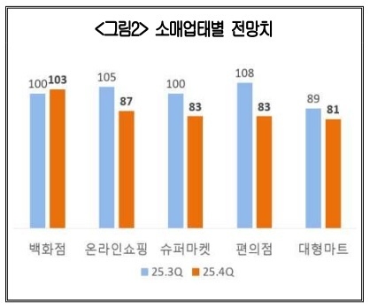 슈퍼마켓(83)은 온라인 장보기 확산으로 가격 경쟁이 심화되고, SSM(기업형슈퍼마켓)의 경우 전통시장 주변 입점 제한 규제가 2029년까지 4년 더 연장되면서 경기전망을 어둡게 했다. 편의점(83)은 전 분기(108) 대비 가장 큰 폭으로 하락했다. 편의점은 겨울철 비수기 유동인구 감소, 과잉 경쟁 및 인건비 상승 부담 등이 복합적으로 작용한 결과다.