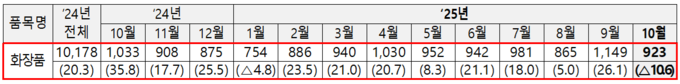 산업통상부가 발표한 ‘2025년 10월 수출입 동향’에 따르면 화장품 수출은 전년 동기 대비 10.6% 감소한 9억 2,300만 달러를 기록했다.
