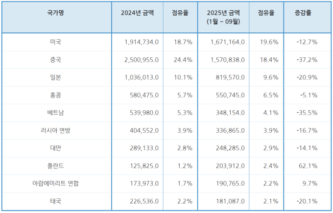 미국으로의 수출은 관세 영향으로 자동차·차부품·철강·일반기계 등 주요 품목이 약세를 보이면서 전체적으로 16.2% 감소한 87억 1,000만 달러를 기록, 9대 지역 중 유일하게 두 자릿수 감소율을 기록했다.