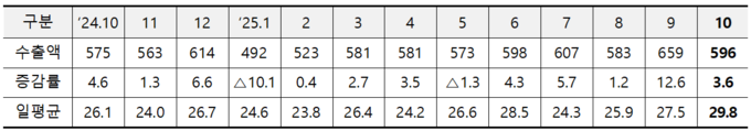 10월 수출은 추석 연휴로 인한 조업일 축소에도 불구, 역대 10월 중 최대실적인 595억 7,000만 달러(+3.6%)를 기록하면서 6월부터 5개월 연속 플러스 흐름을 이어갔다. 일평균 수출(29억 8,000만 달러, +14.0%)은 전 기간 기준 최대치를 경신했다.