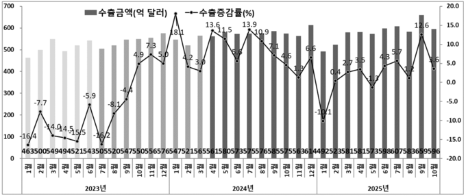 다만 10월에는 수출 규모가 9억 달러대로 감소하고 전년 대비 수출 증가율은 두자릿수 감소세를 나타냈다.
